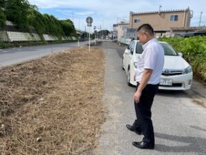 国道4号バイパス側道の法面が土手で、季節になると雑草繁茂で近隣住民から苦情を受け現地を調査。法面を防草する必要性を確認。