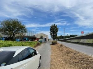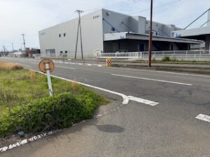 ①道路幅員6mの県道62号線、運送会社の大型車両が交差するには狭くガードレールに接触